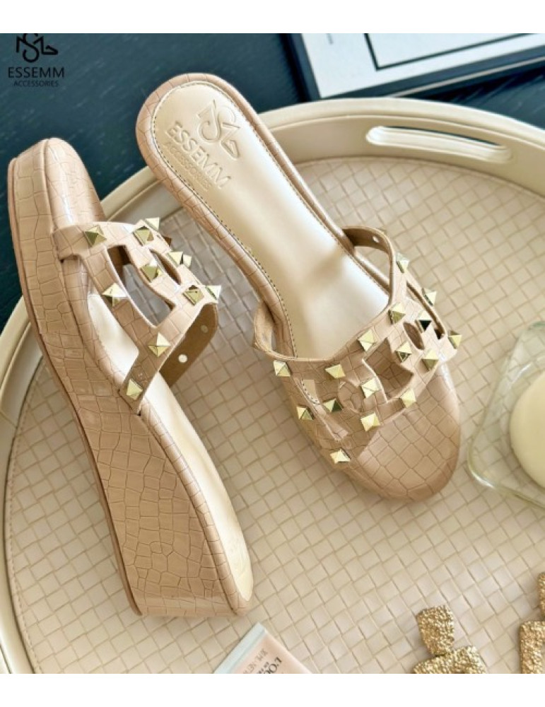 BEIGE STUDDED SLIDES IN A WEDGE