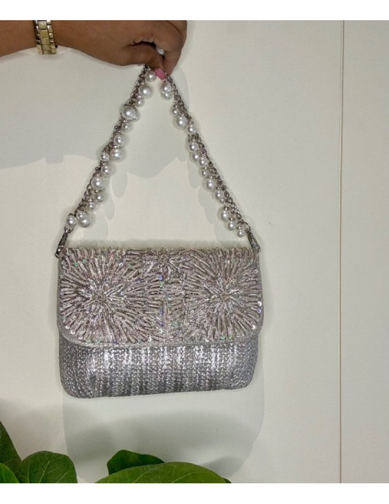 Silver clutch with embroidered flap and jute base. Comes along with a pretty pearl handle.