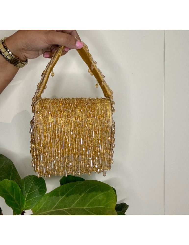 Small size clutch with full beaded embroidery in gold colour and comes with handle for ease to carry. Smart and perfect party eye candy.